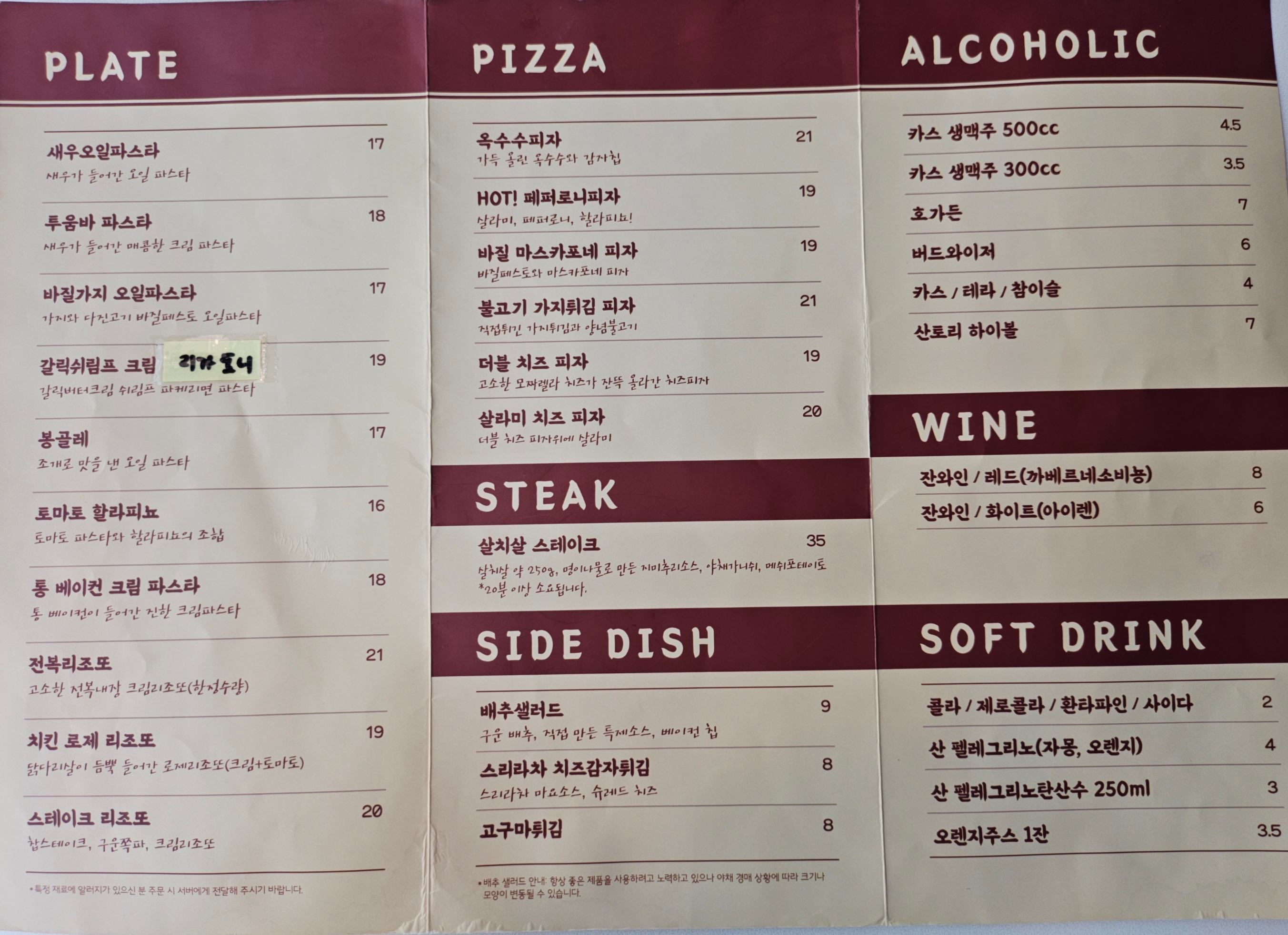 피자종류가 마르게리타나 콤비같은 기본피자가 있음 더 좋았겠네요 잘먹고갑니다