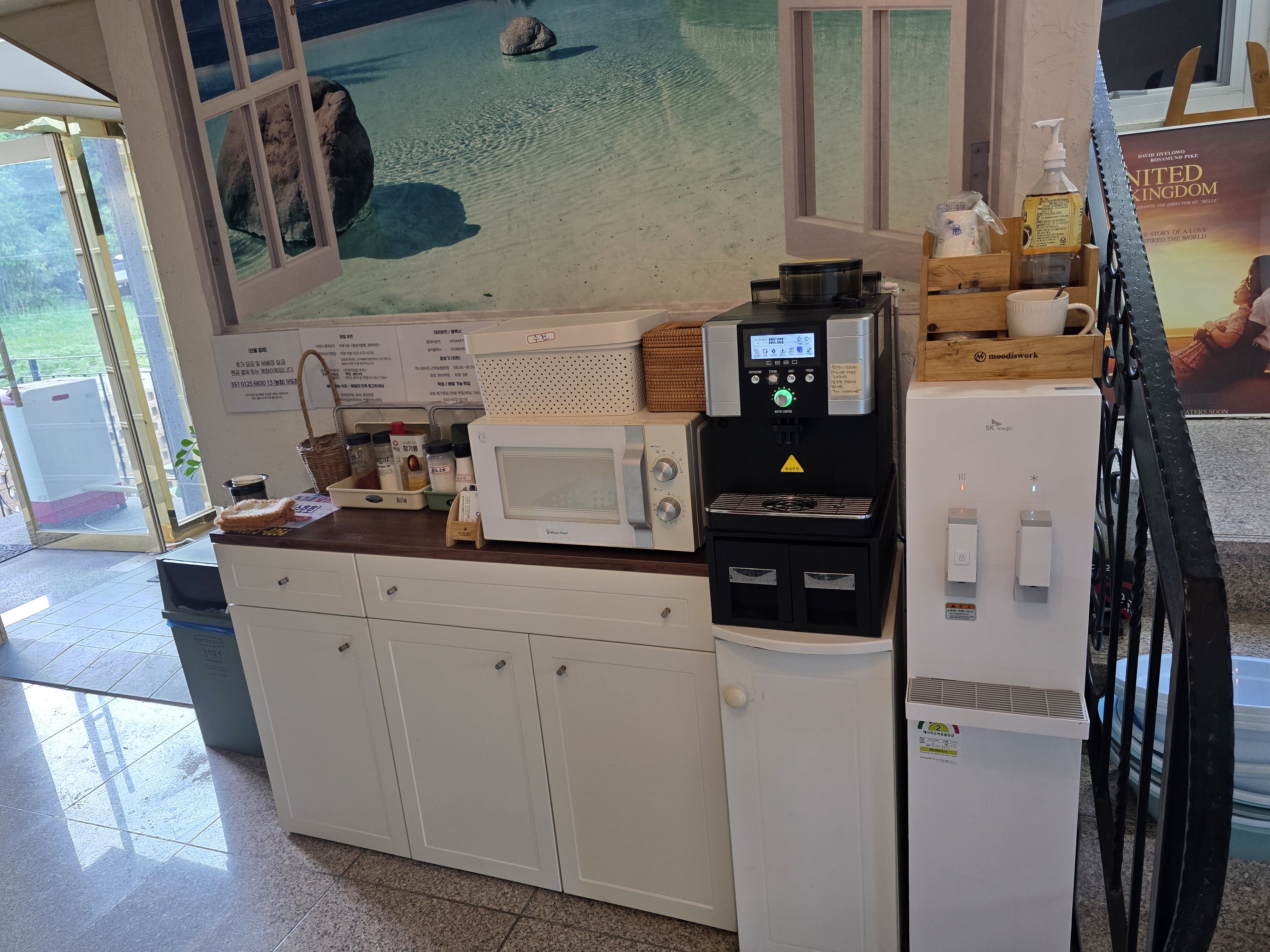 1층에는 커피, 정수기, 전자레인지, 후추, 소금 등 고기구울때 필요한것들 비치되어있습니다