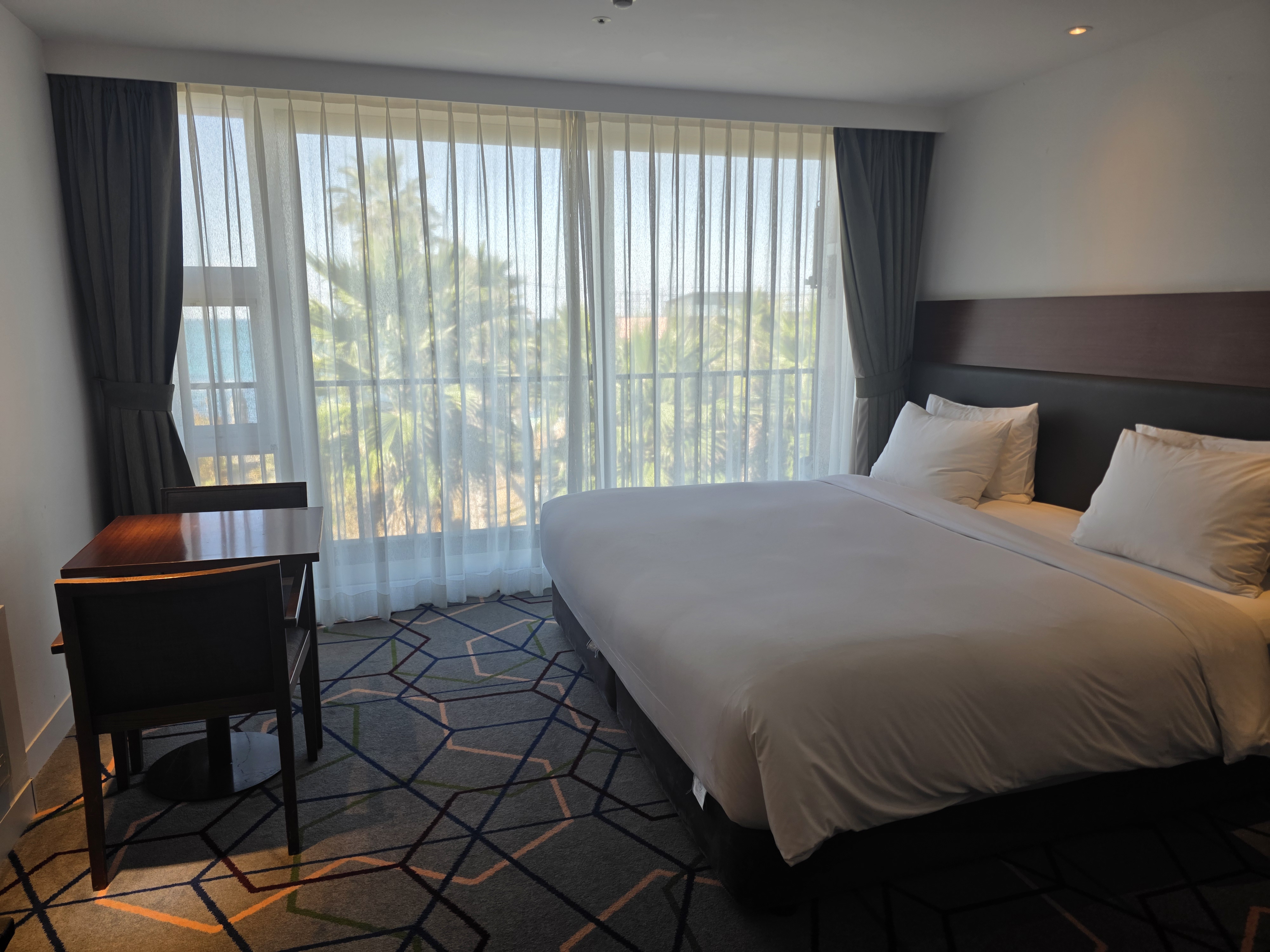 객실은 군더더기 없이 깔끔한 화이트 톤이며 베란다 밖으로 펼쳐지는 탁 트인 오션뷰가 정말 매력적인데요