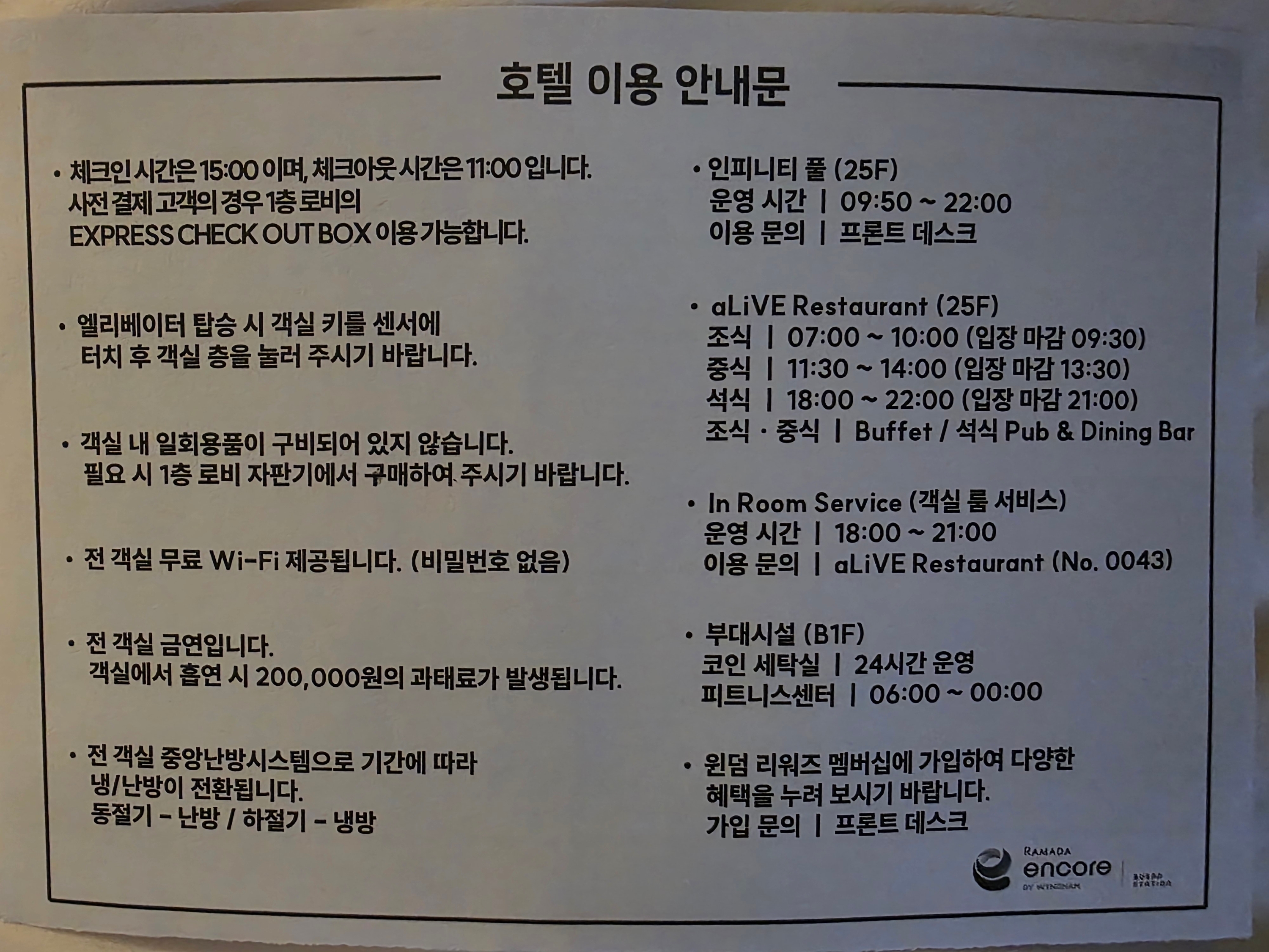룸서비스나 부대시설 이용 시간은 객실 내 비치된 안내